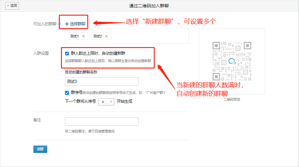 我们可以通过企业微信有批量建群功能,解决人数限制,并提高拉群效率。当第一个群满员后,其余客户会进到自动新建的群里,不需要我们手动建群,客户群满员后,我们也不需要更换入群二维码。