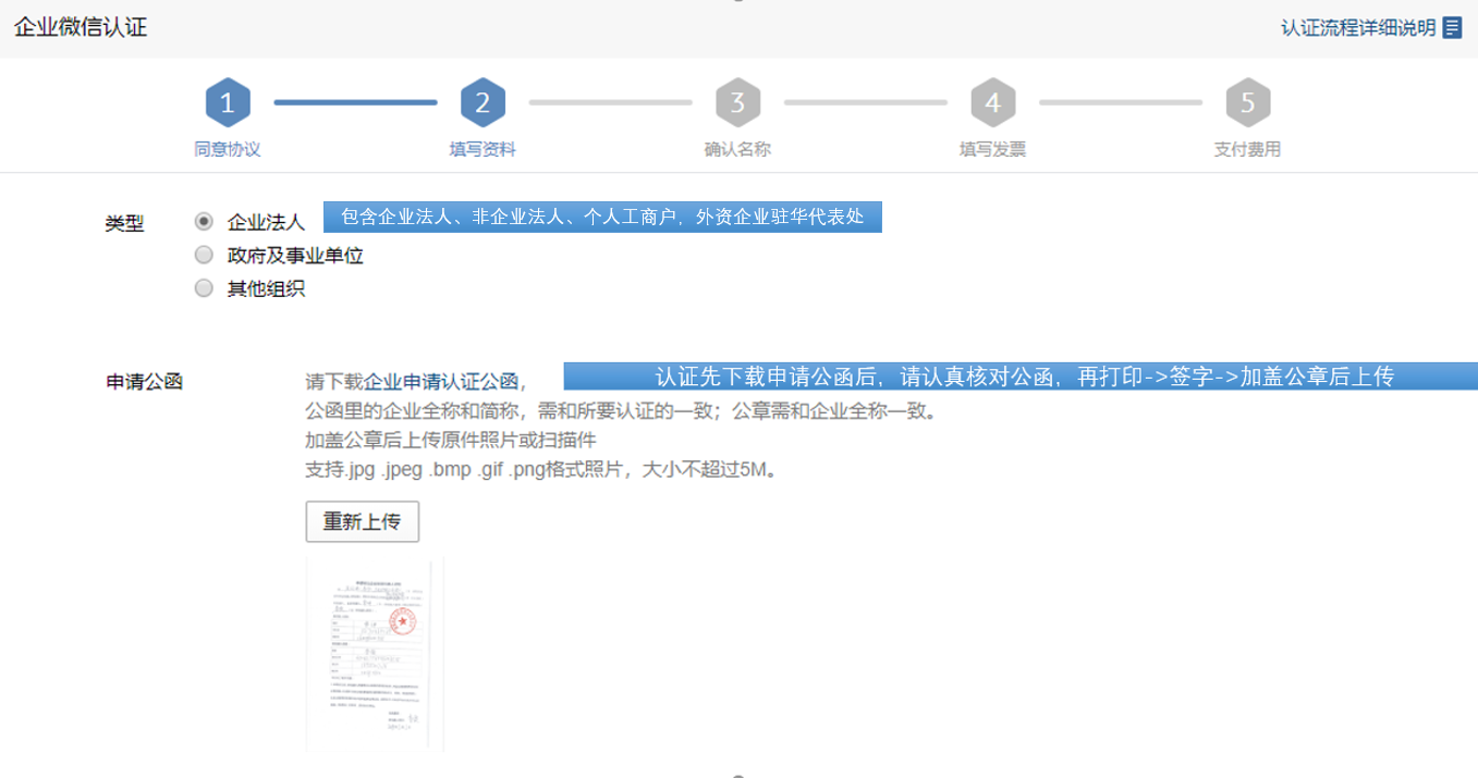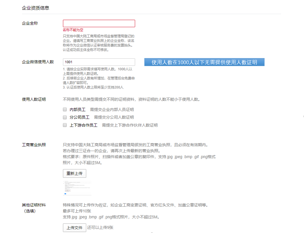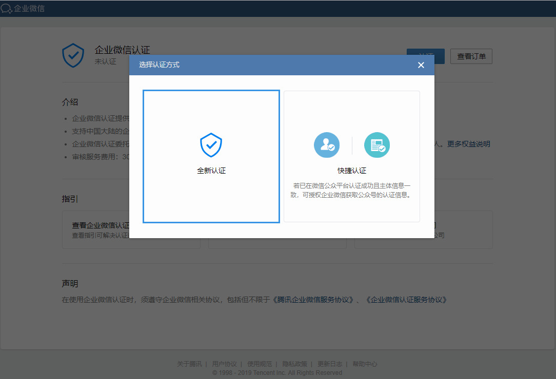 登录企业微信->我的企业->企业信息->验证主体信息->通过提交资料验证->企业微信认证->全新认证