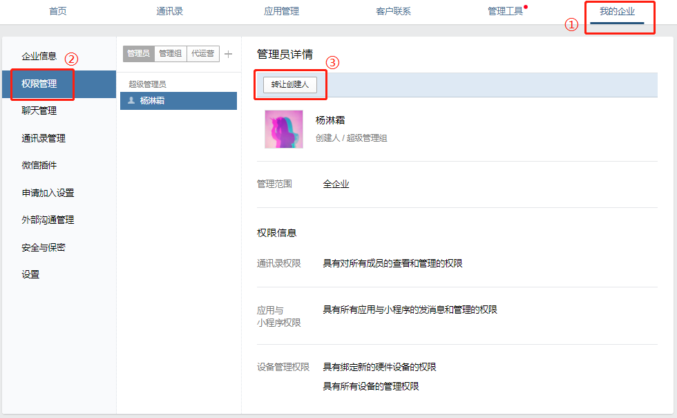 邀请企业法人进入公司企业微信,然后注册人进入企业微信管理后台,在【我的企业】-【权限管理】页面中就可以看到转让创建人选项。选择转让创建人,扫码确认身份,再将企业法人设置为新的创建人,就完成了转让操作。
