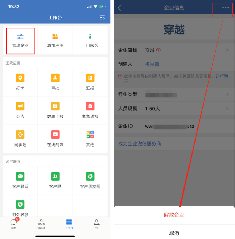 方式二:管理员在企业微信手机端,点击【工作台】-【管理企业】-【企业信息】页面,点击一下右上角的三个点,就可以看到解散企业按钮