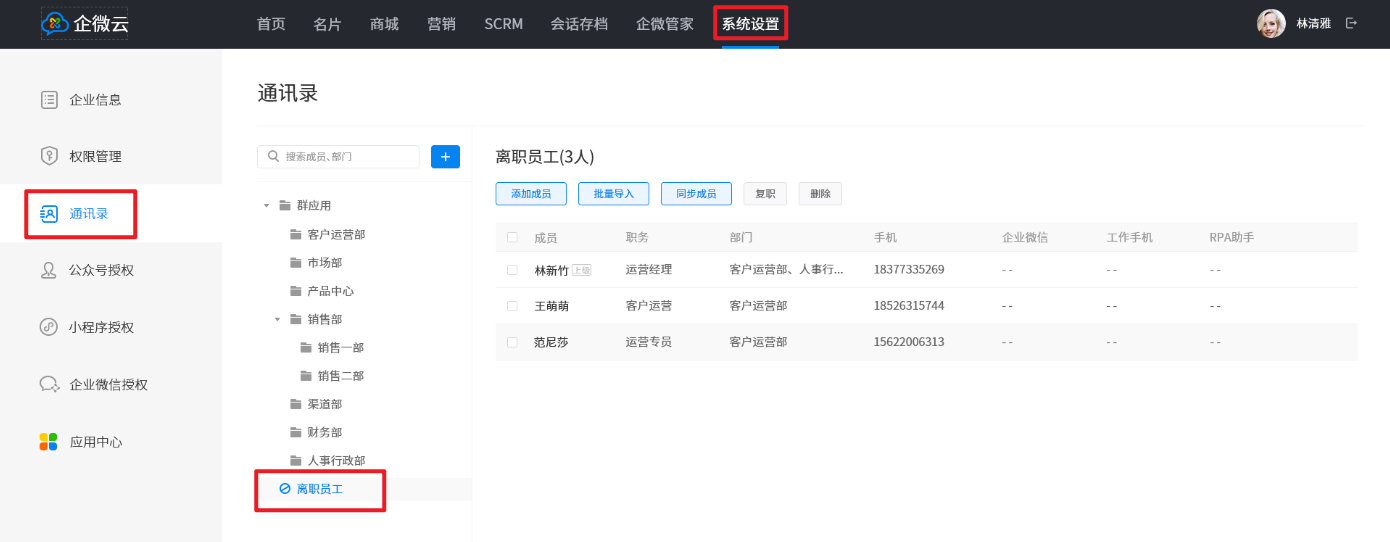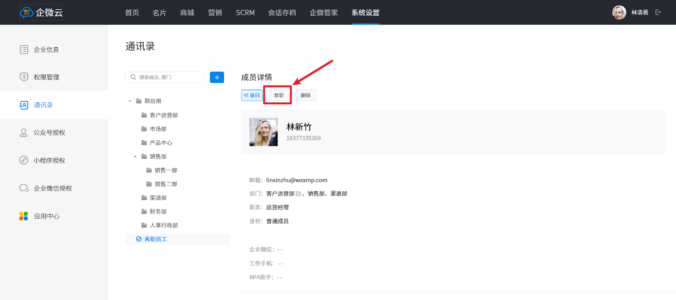 将你的企业微信授权给企微云后,通过企微云即可对已离职员工进行复职操作。具体操作如下: