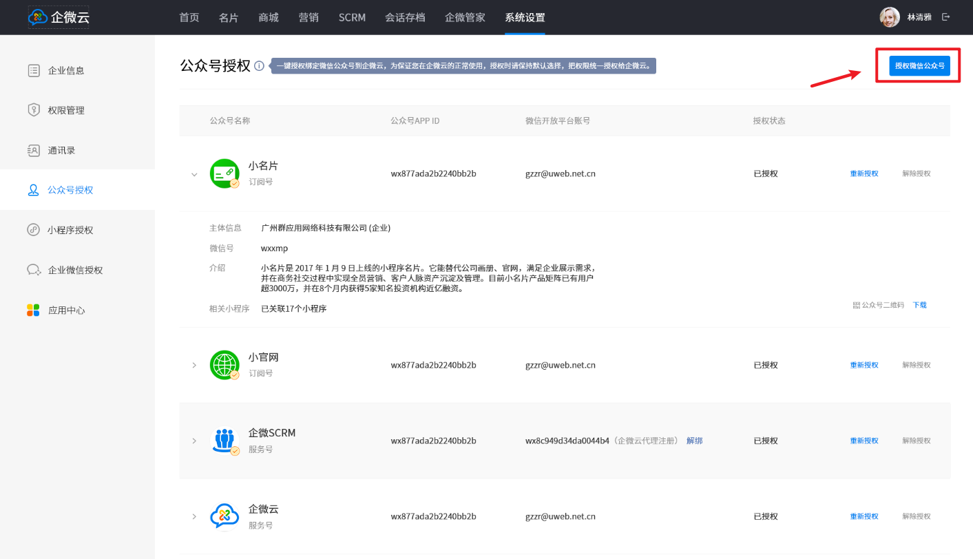在使用企微云管理企微客户池的过程中,如何将微信公众号也授权到企微云平台,与企业微信一起进行管理呢?具体授权流程请看下文。说明:不论是否已认证的订阅号、服务号均可授权绑定企微云,授权后可以随时解绑,也可以重新授权,不限制授权的公众号数量,可绑定多个。