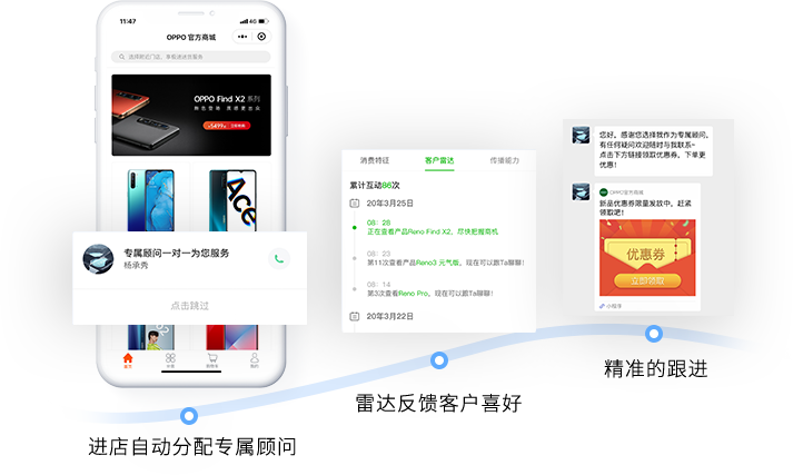 客户进入“品牌云店”,自动分配专属顾问建立微信好友关系。在服务过程中雷达数据实时反馈客户喜好、购买意向,销售导购针对性的进行跟进,提供个性化的服务