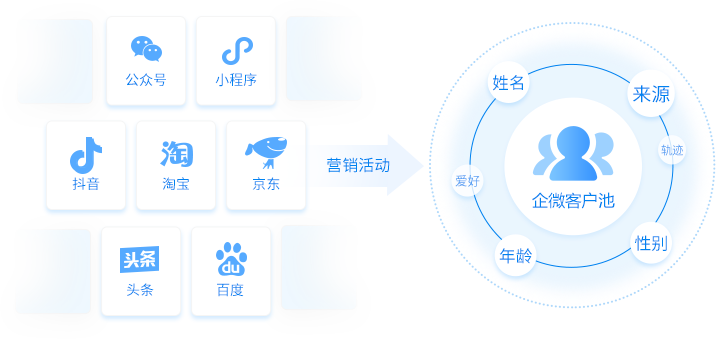商家可通过限时折扣等系列营销活动淘宝、天猫、京东、苏宁、头条、抖音等渠道的流量沉淀至企业微信、公众号,形成商家私域客户池。通过用户的微信唯一身份标识,准确识别客户身份,追踪线索来源,基于企业微信打造商家在微信生态内统一用户画像的高质量客户池,实现客户的持续经营