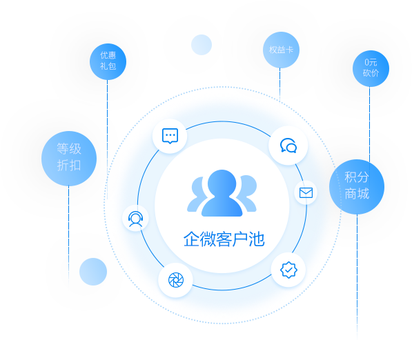 建立企微客户池后,商家可根据客户画像,从微信消息、微信群、服务号、小程序客服、订阅消息、朋友圈等触点持续激活客户,通过会员、积分、优惠礼包、权益卡等运营手段,针对性的开展运营活动,提高老客户的复购率并从中发掘平台的“代言人”,为客户裂变打下基础